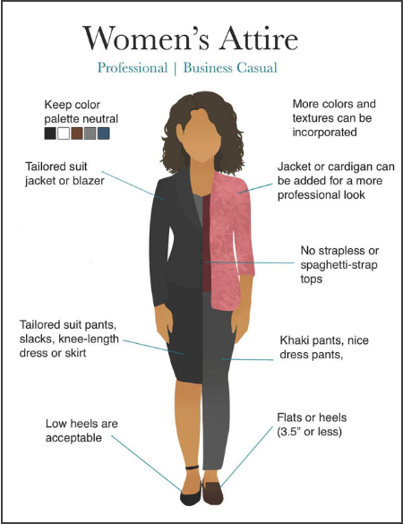 - For women, remember that you are on a stage that is 4-5 steps higher than your audience. Dresses/Skirts should be about knee length in all spots, not just most of it.